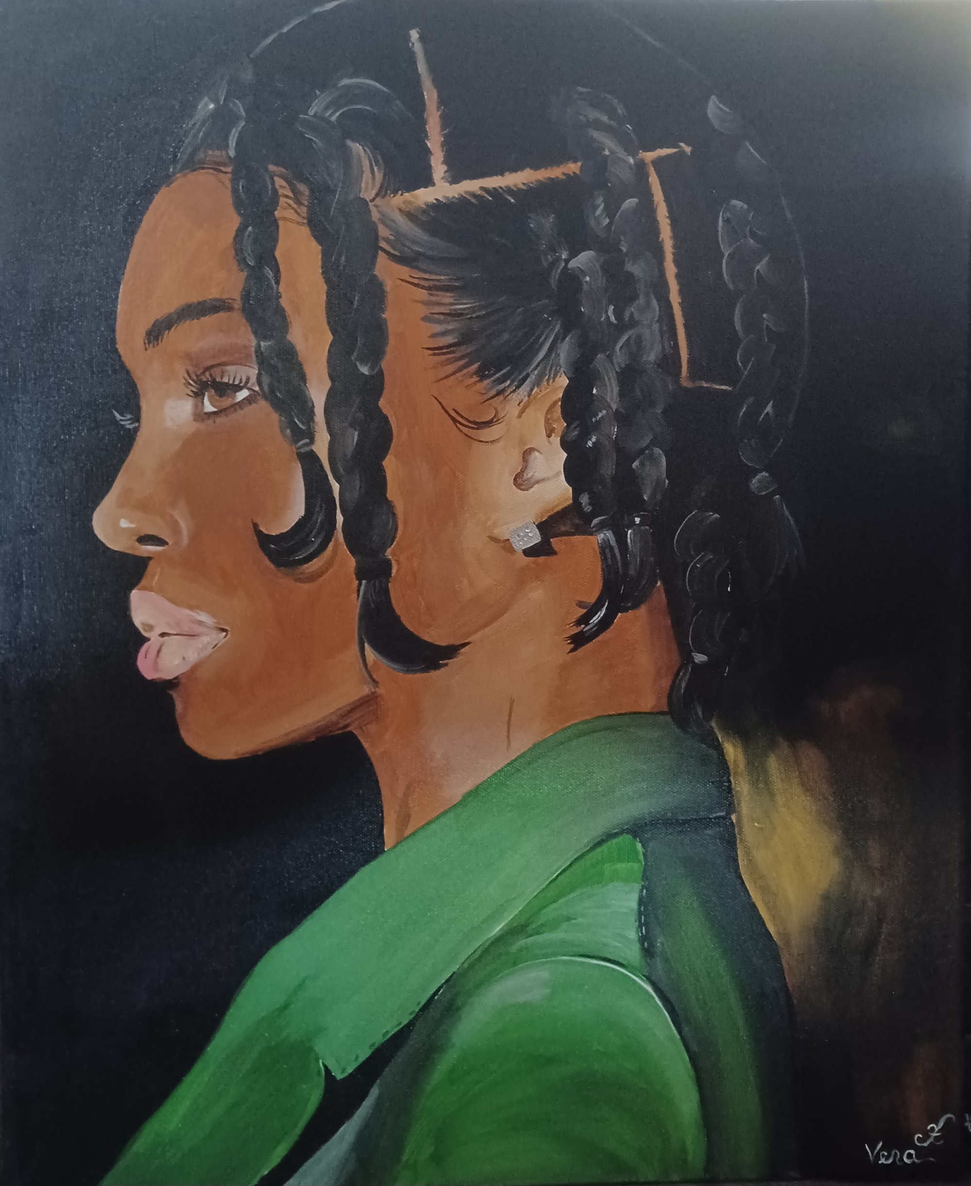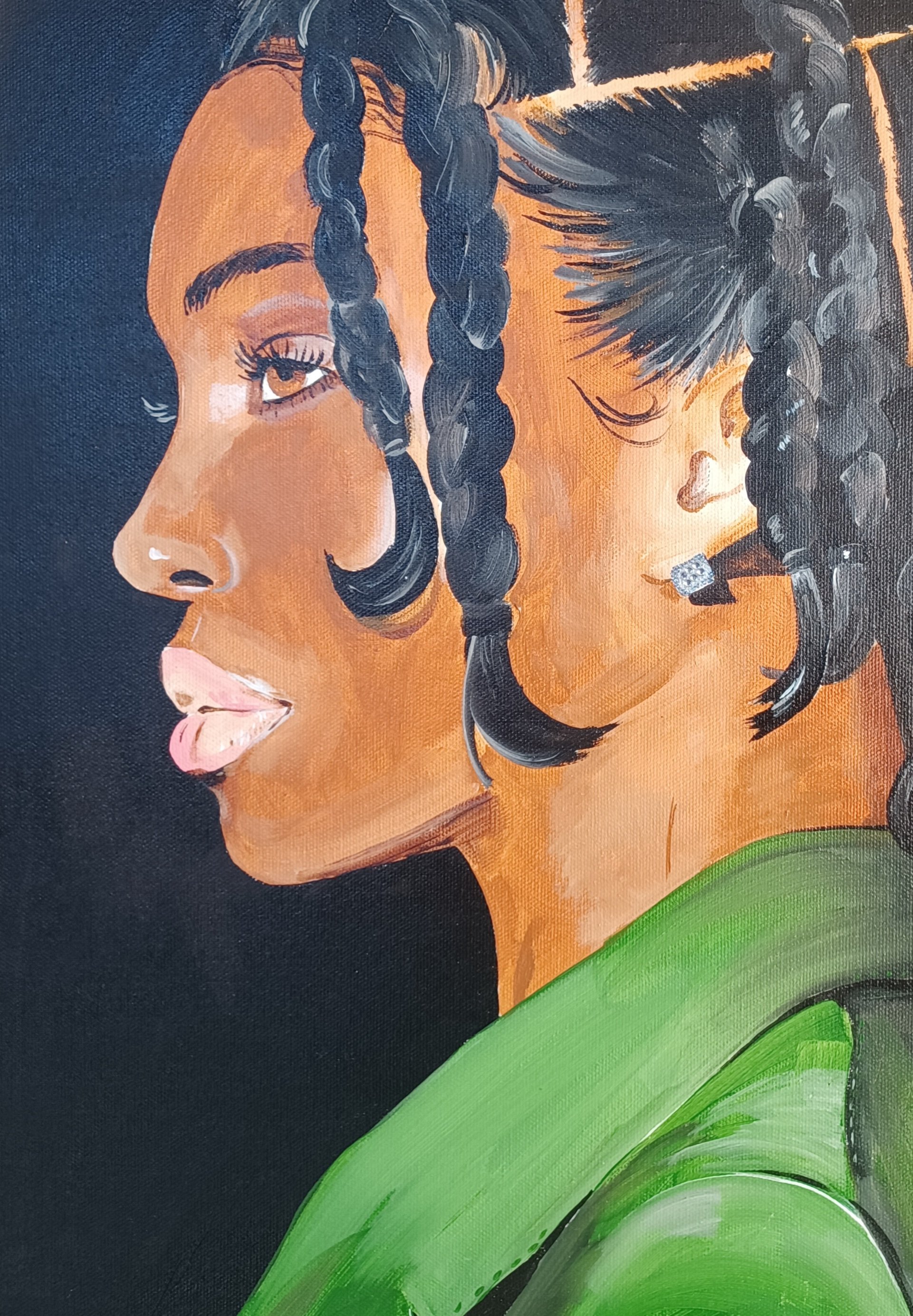 "16 x 20" acrylic on canvas. Rhinestone embellishment earring.